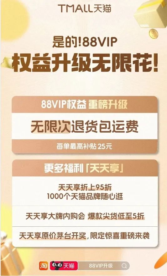 以淘寶為例,自去年雙11起,其持續(xù)為尊貴的88VIP用戶升級各項權(quán)益,不僅新增了“購物卡”和“全能卡”,更精心策劃了包含天天紅包、退貨運(yùn)費(fèi)包和售后保障包的電商購物“新三包”權(quán)益,為高質(zhì)量消費(fèi)人群帶來了更加優(yōu)質(zhì)、便捷的購物體驗。