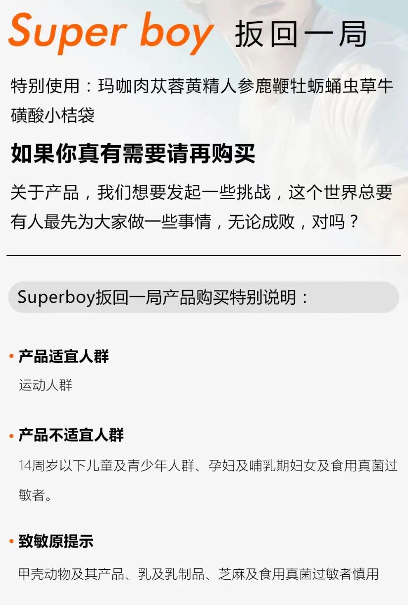 此外,Blueglass“Superboy男友力扳回一局”產(chǎn)品也提醒,18周歲以下和60周歲以上的人群、心臟病和高血壓患者應(yīng)當避免食用。同時,對于甲殼動物及其產(chǎn)品、乳及乳制品、芝麻及食用真菌過敏者,也應(yīng)謹慎使用。