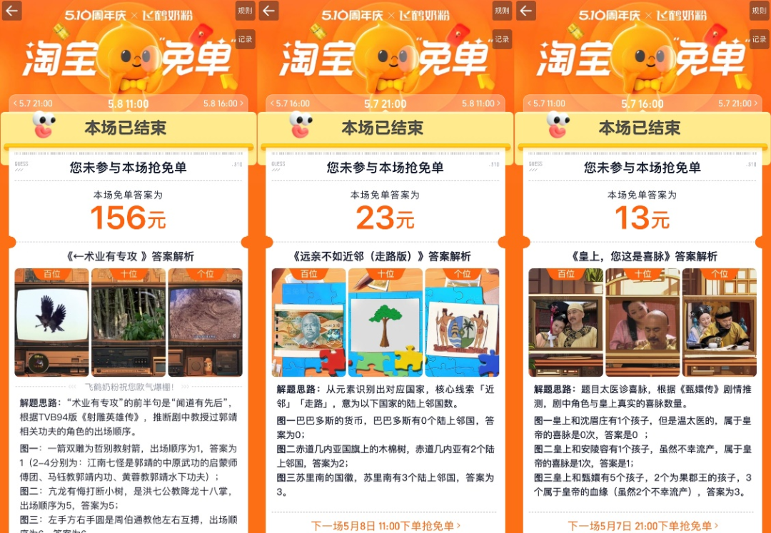 鋅刻度了解到,淘寶免單活動從5月6日持續(xù)到5月8日,不同時段的免單活動會出不同題目,用戶根據(jù)圖片猜測免單金額的范圍,然后再下單相應(yīng)產(chǎn)品,就有機會拿免單名額。