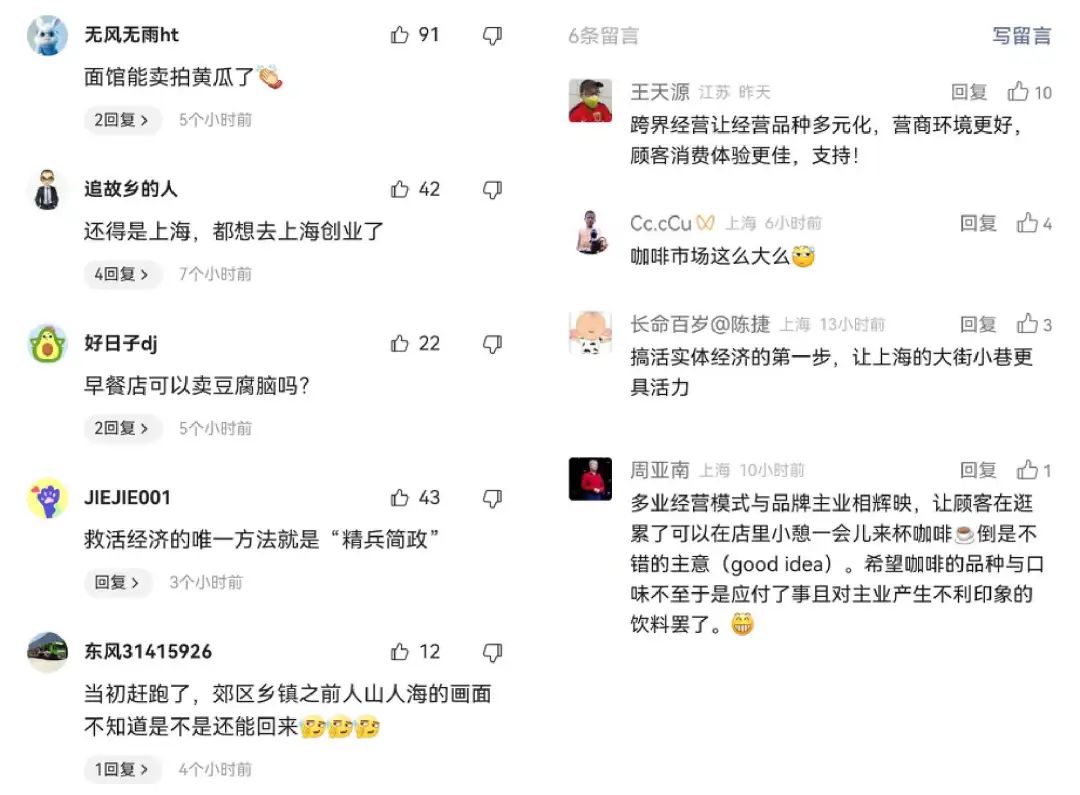 有人表示“還得是上海,都想去上海創(chuàng)業(yè)了”,有人直言“本來就不該限制,現(xiàn)在實(shí)體店生存多困難啊,很多來自不合理的條條框框”,有人坦言“如何面對(duì)后期的各種檢查,這才是經(jīng)營者首先考慮的重點(diǎn)”。
