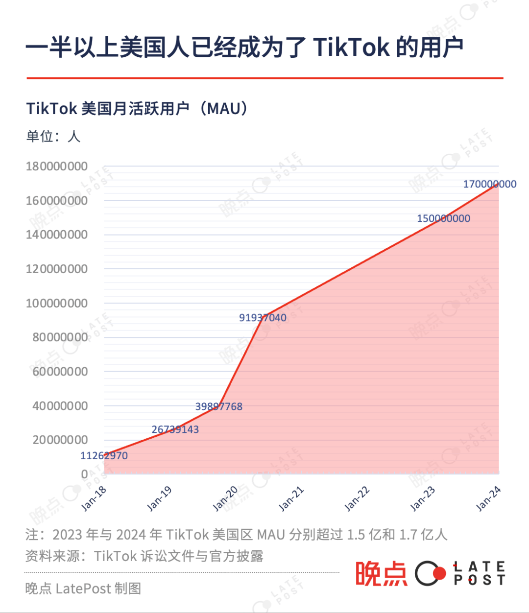 如今,TikTok不僅是全世界最受歡迎的應(yīng)用之一,在其最重要的美國(guó)市場(chǎng)也頗有地位。據(jù)了解,截至2024年1月,TikTok美國(guó)月活用戶超過(guò)1.7億,達(dá)到美國(guó)人口的一半以上。