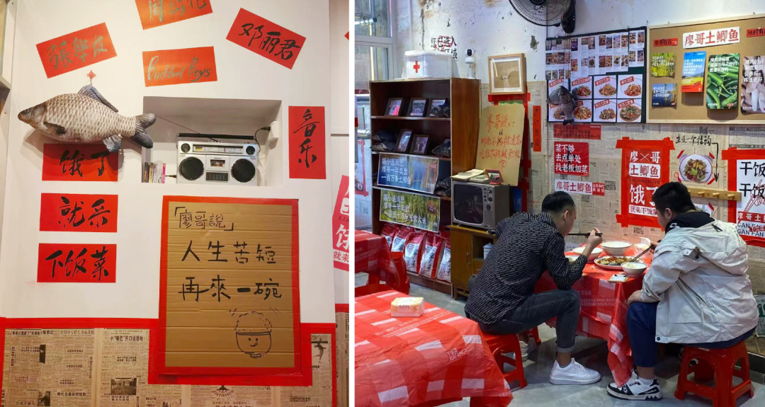 廖哥土鯽魚的眾多門店沒有統(tǒng)一的裝修模版,都是因地制宜,隨性而為,統(tǒng)一在一種“破舊風(fēng)”之中。這樣的裝修風(fēng)格很容易拉近和消費(fèi)者的距離。