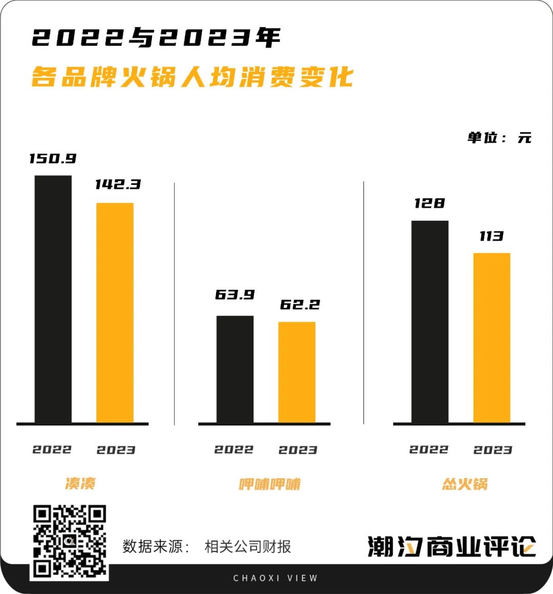 無獨有偶,湊湊的人均消費也在減少,2022年湊湊人均消費為150.9元,到了2023年減少至142.3元。呷哺呷哺的人均消費從2022年的63.9元減少至2023年為62.2元。九毛九集團(tuán)旗下的慫火鍋,2022年人均消費為128元,2023年為113元。