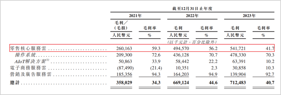 報(bào)告期內(nèi)公司零售核心服務(wù)業(yè)務(wù)增長較快,由2021年的4.39億增長至2023年的12.99億,營收占比由42%提升至74.3%,但業(yè)務(wù)毛利率卻由59.3%降至41.7%。