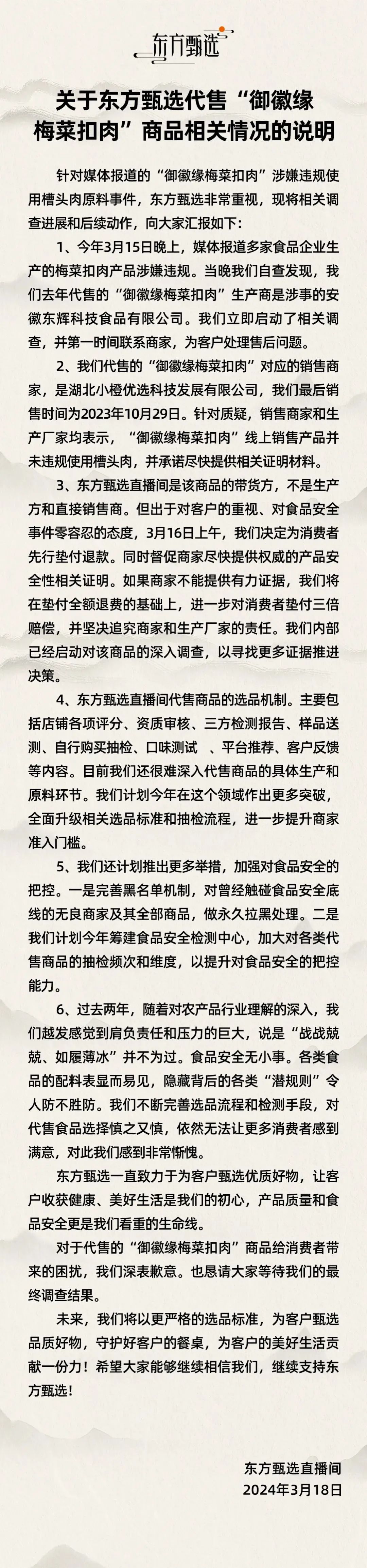 被3·15曝光后,東方甄選和三只羊網(wǎng)絡(luò)都于3月18日公開道歉。根據(jù)公告,東方甄選稱將為消費(fèi)者先行墊付退款,若廠商不能提供相關(guān)證明,進(jìn)一步墊付三倍賠償;三只羊則表示已啟動(dòng)墊付退款工作,未提到三倍賠償。