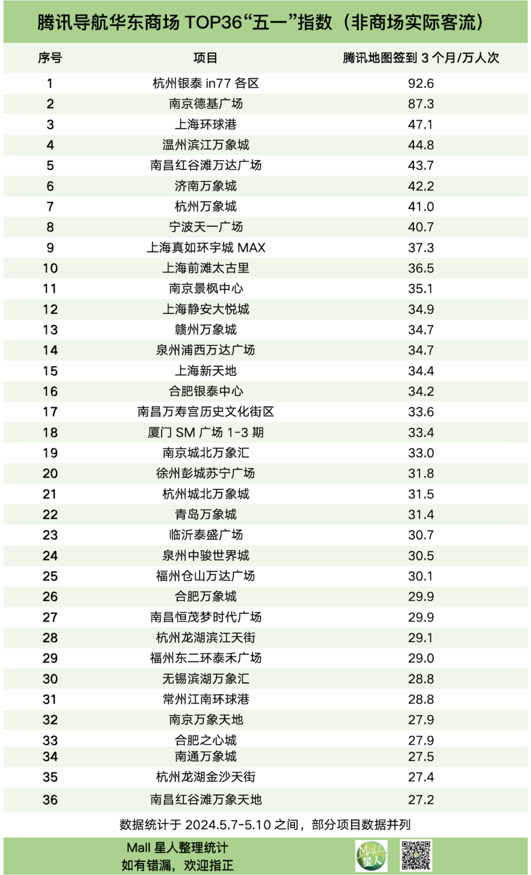 此外,泰安泰山萬達廣場、莆田城廂萬達廣場、金華義烏之心、菏澤佳和城五一客流表現(xiàn)出色,逼近華東TOP36騰訊門檻。
