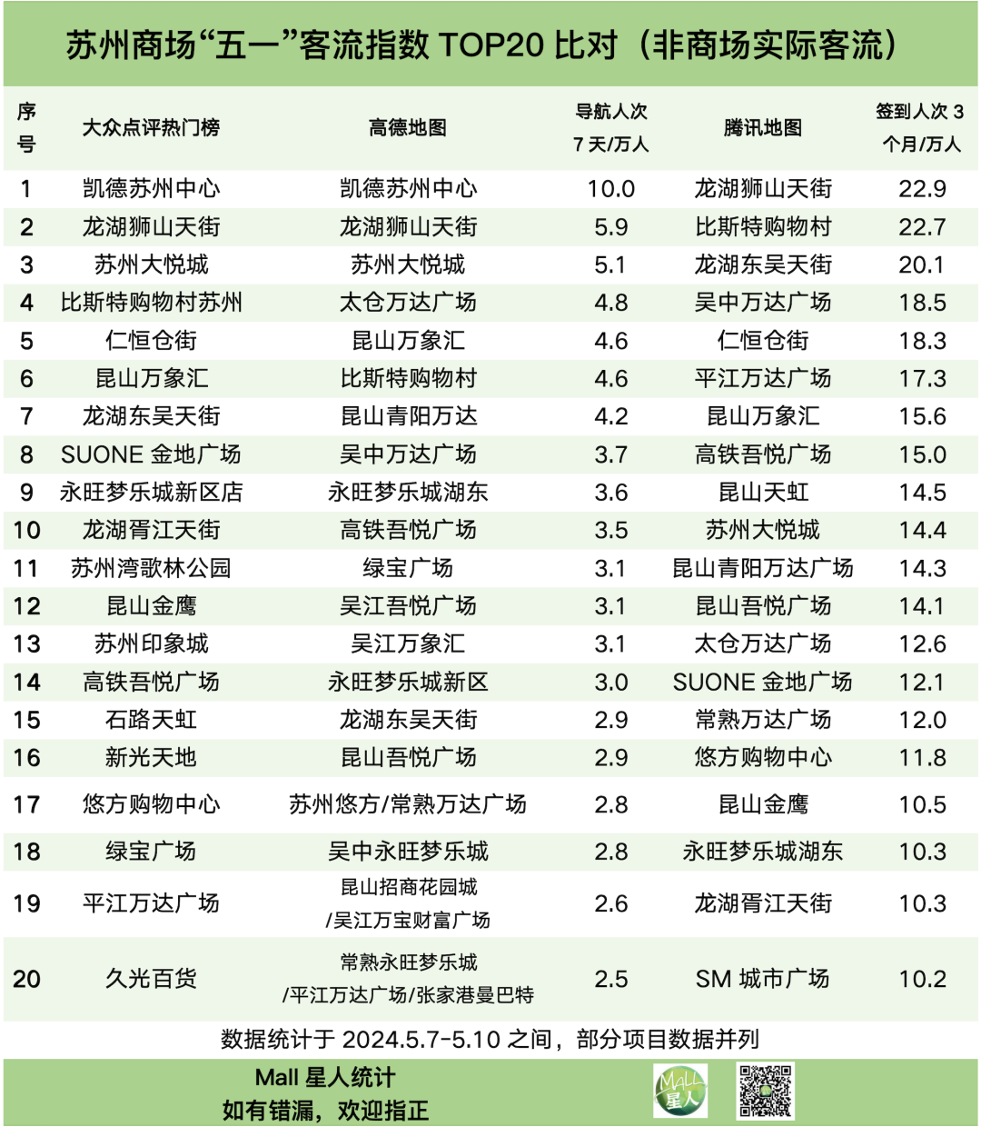 【TIPS】上表為蘇州五一客流指數(shù)TOP20商場名單。由于篇幅所限,后面我們會有專文詳解華東代表性13座城市的商場客流指數(shù),并附上全部13座城市的客流指數(shù)TOP20商場,敬請關(guān)注。