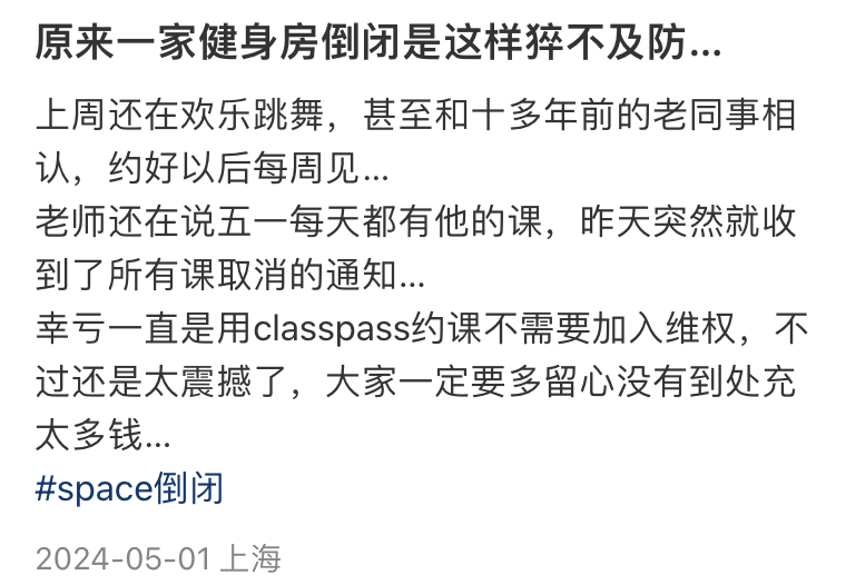 4月30日,五一小長假來臨前一天晚上,Space突然宣布自5月1日起所有門店停止運營,公司將依法進入清算狀態(tài)。事情發(fā)生得如此突然,讓準備快樂迎接假期的會員們措手不及。