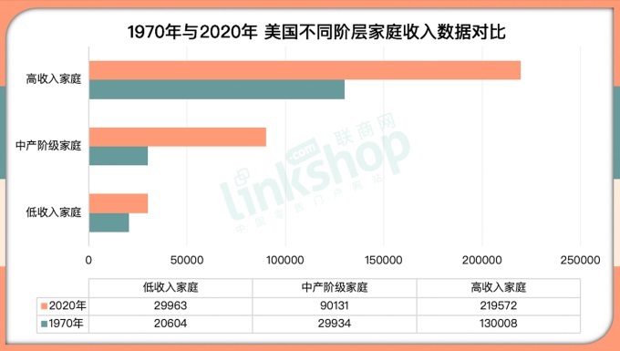 1970年至2020年,美國高收入家庭的收入增長最為迅猛。在此期間,他們的收入中位數(shù)增長了69%,從130008美元增至219572美元。而低收入家庭的收入中位數(shù)增長較慢,從20604美元增至29963美元,增幅為45%。