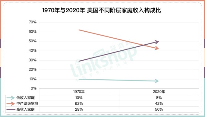 民調(diào)機(jī)構(gòu)皮尤研究中心的調(diào)查發(fā)現(xiàn),自1970年以來,美國家庭整體收入有了顯著提升,但中產(chǎn)階級家庭收入的提高幅度遠(yuǎn)不及高收入家庭。以2020年的美元計算,當(dāng)年中產(chǎn)階級家庭的收入中位數(shù)比1970年增加了50%,從59934美元上漲至90131美元。