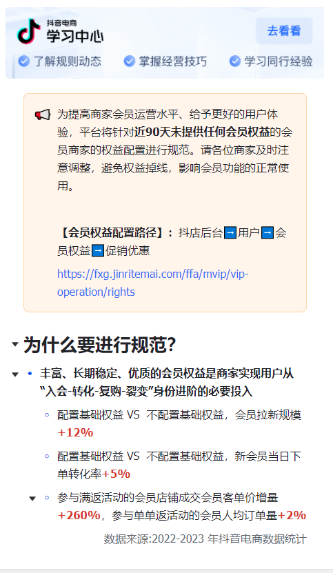 根據(jù)抖音發(fā)布的公告,平臺將針對近90天未提供任何會員權益的會員商家的權益配置進行規(guī)范。