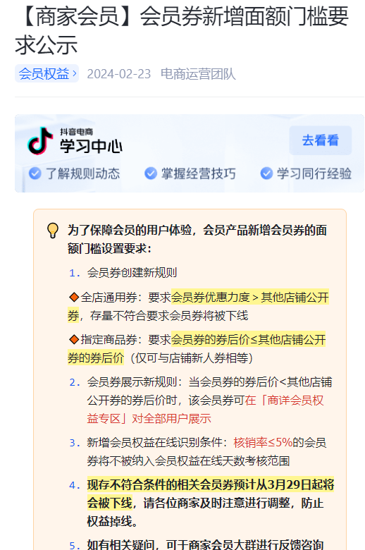 后臺將會對目前現(xiàn)存已創(chuàng)建的會員券進行校驗,不符合門檻要求的會員券將會被下線并且通過抖店后臺通知商家。
