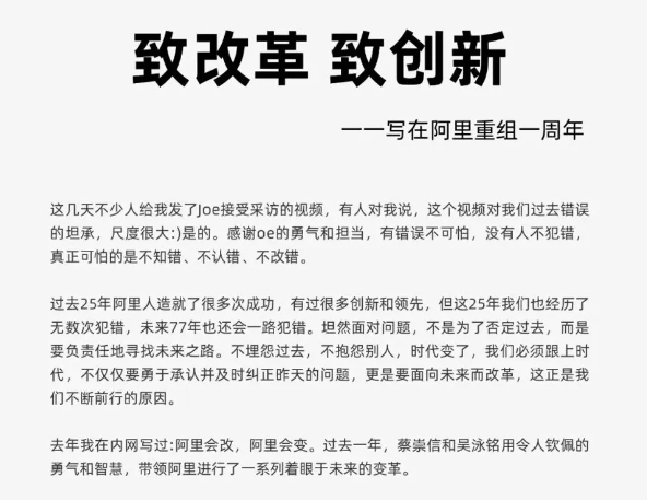 馬云也少見地在內(nèi)網(wǎng)分享長文,坦言過去25年阿里經(jīng)歷了無數(shù)次犯錯,“時(shí)代變了,我們必須跟上時(shí)代”、“這一年最核心的變化,不是去追趕KPI,而是認(rèn)清自己,重回客戶價(jià)值軌道!