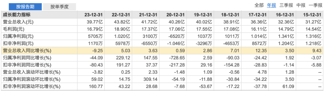 財報顯示,來伊份在2023年實現(xiàn)營業(yè)收入39.77億元,上年同期為43.82億元,同比下降9.246%。歸屬于上市公司股東的凈利潤為5705萬元,上年同期為1.02億元,同比下降44.09%。