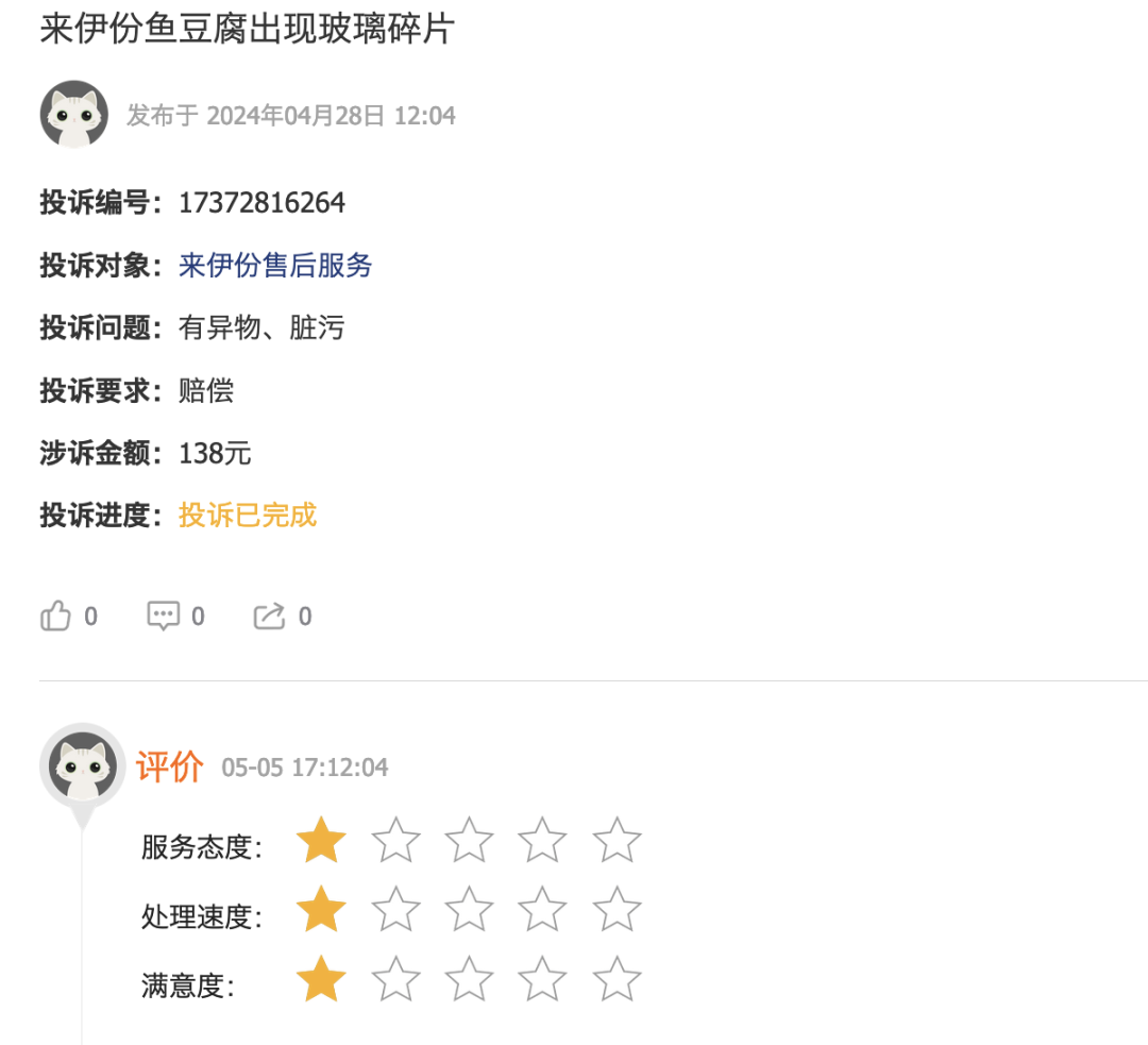 來伊份的官方賬號在4月28日和5月4日兩度回復(fù)該起投訴,最終用戶在5月5日確認(rèn)投訴完成,但他給這起投訴的處理結(jié)果評價為1顆星(滿分5顆星)。
