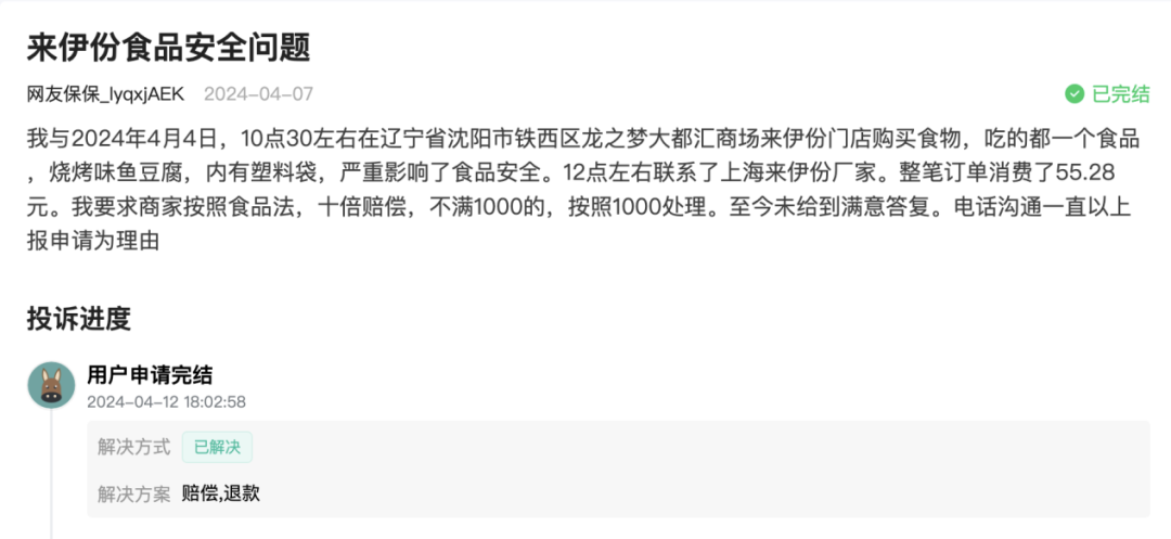 來伊份公司在4月7日跟進(jìn)了這起投訴,最終4月12日,發(fā)起投訴的網(wǎng)友申請完結(jié),解決方案是企業(yè)賠償、退款。