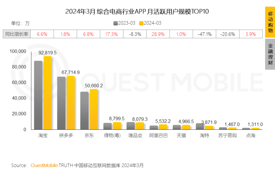 全面改革下,有更多的商家愿意加入淘天。根據(jù)天貓公布的2024年第一季度開店數(shù)據(jù),新入駐商家數(shù)同比增長60%,新商家同比增長率突破100%;根據(jù)QuestMobile統(tǒng)計,2024年3月份,淘寶月活達到驚人的9.28億,增幅6.6%,而阿里巴巴的增幅是28.9%。