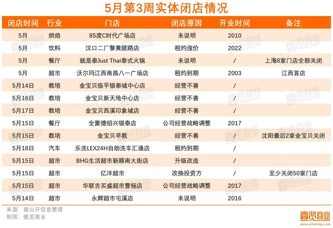 據(jù)壹覽商業(yè)不完全統(tǒng)計(jì),5月第3周,共有11個(gè)品牌關(guān)閉了至少71家門店。金寶貝多地暴雷,至少關(guān)閉5家門店,漢口二廠面臨經(jīng)營危機(jī)。