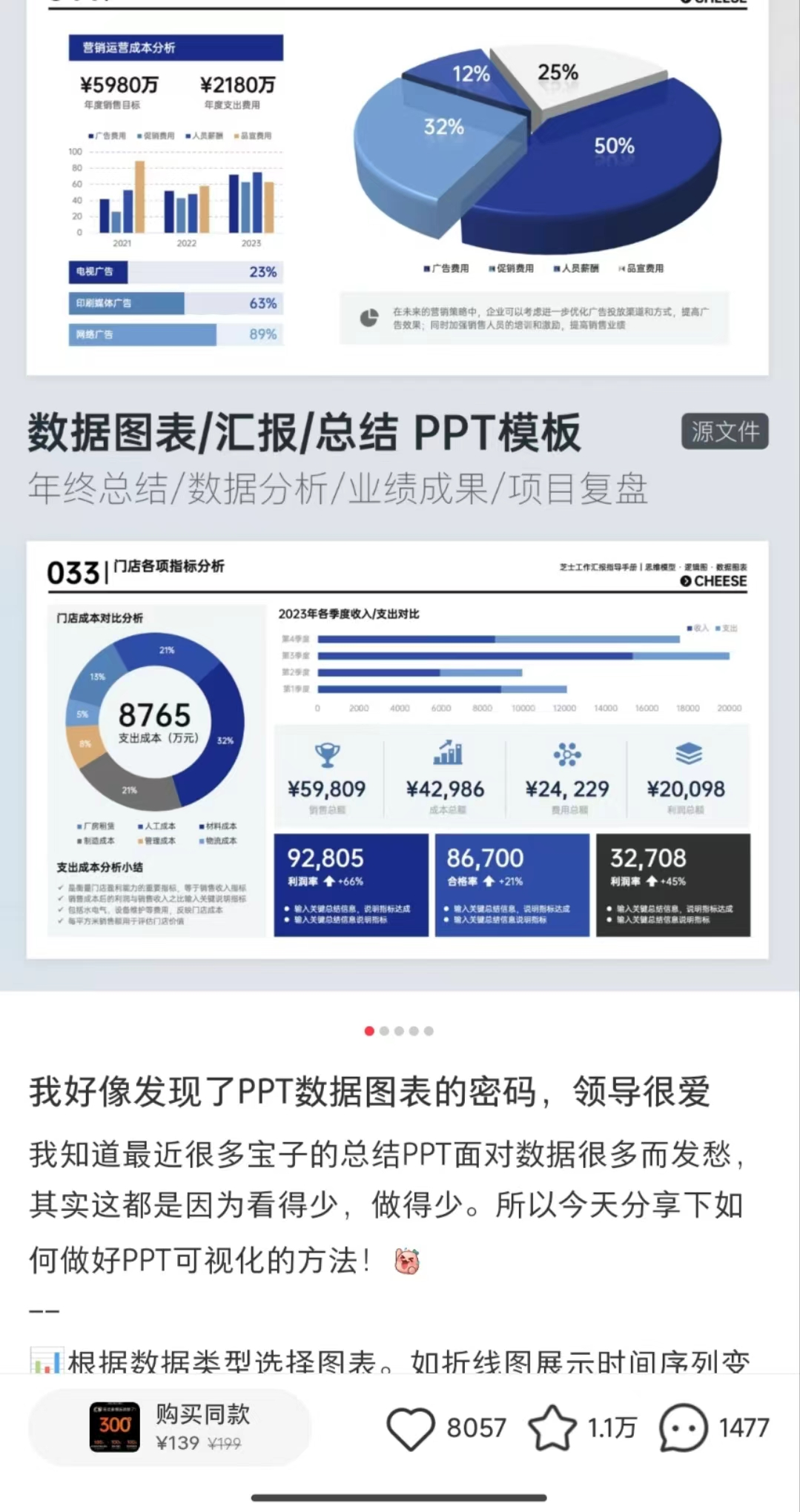 在辦公學(xué)習(xí)場景,比較常見的是PPT模板,以下圖筆記為例,一個單價139元的年終匯報PPT模板,在不到半年的時間里,賣出了近8000份。當(dāng)然,這是在模板原創(chuàng)的前提下,才能賣出的單價。如果在非原創(chuàng)的情況下,價格通常是10元左右。