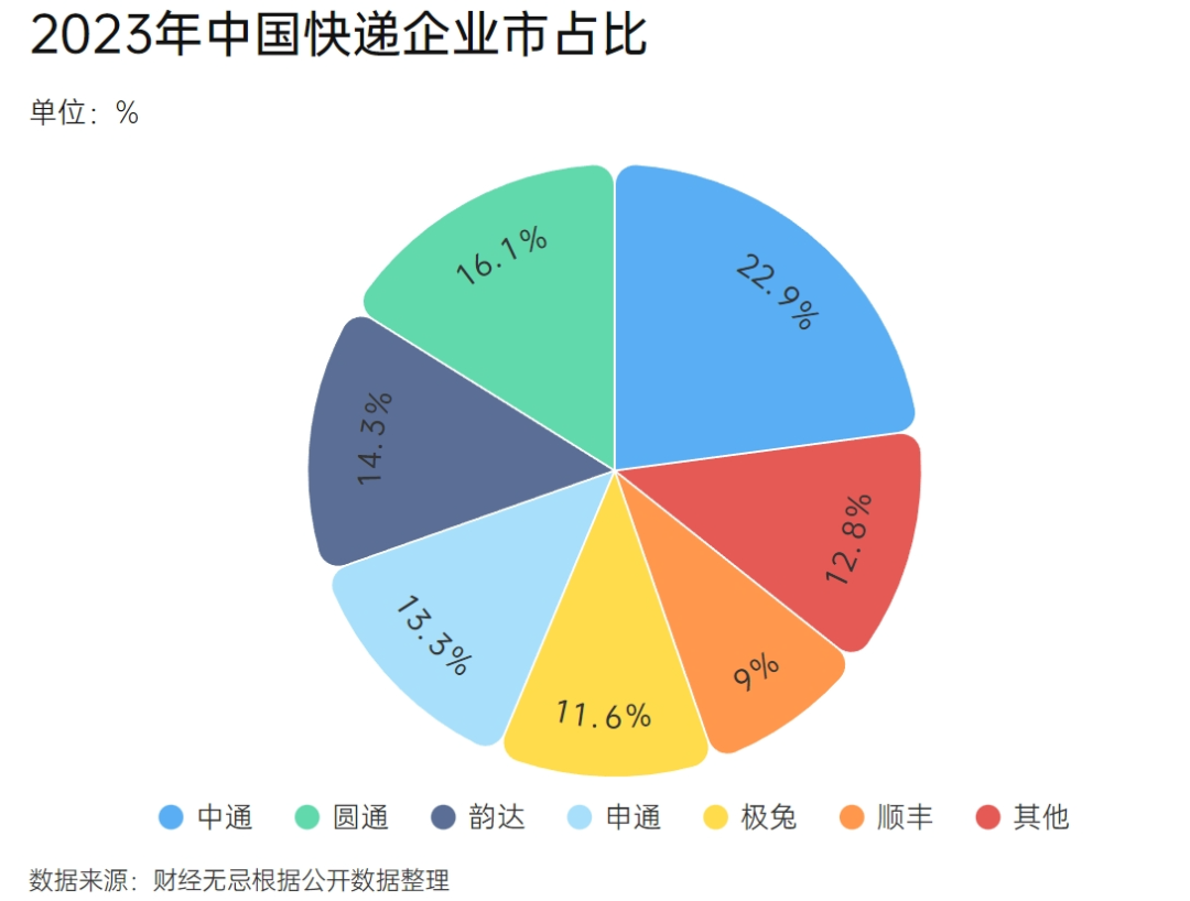 根據(jù)公開數(shù)據(jù)計(jì)算,2023年全年,中通、圓通、韻達(dá)、申通、極兔、順豐的市占率分別為22.9%、16.1%、14.3%、13.3%、11.6%和9%。無疑,最先受到?jīng)_擊的將是韻達(dá)。