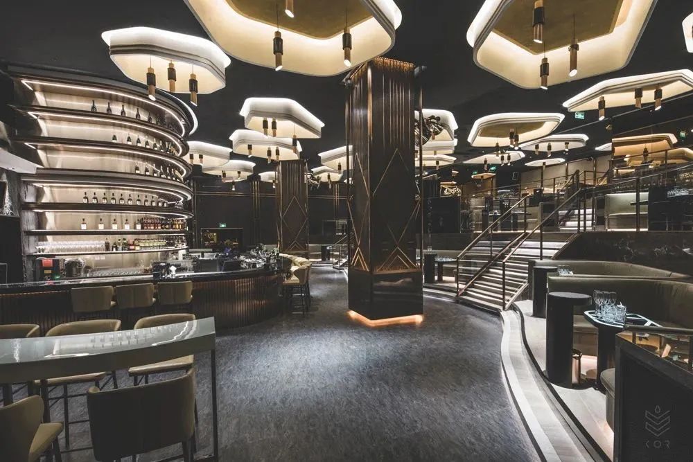 資料顯示,KOR Shanghai號稱亞洲首家Super Lounge,位于靜安區(qū)南京西路1717號會德豐國際廣場南院2樓,門店面積1000余㎡,集餐廳、酒吧、酒廊、Club于一身,經(jīng)營模式是“日餐夜酒”,門店裝修也是高級的黑金主調(diào)。配置方面,有米其林星級料理、世界級調(diào)酒工藝,還有全球最前衛(wèi)的音響系統(tǒng),其劇場式的室內(nèi)設(shè)計(jì)更是贏得了德國iF大獎。
