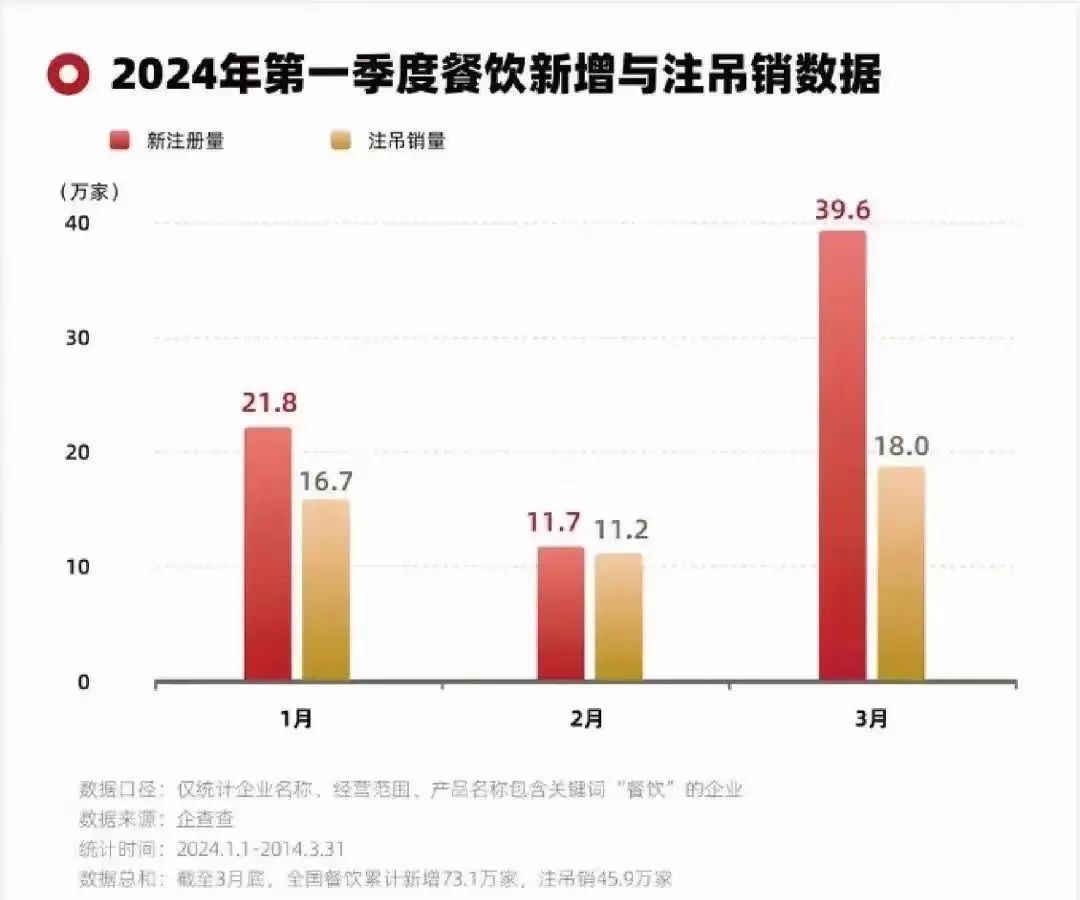 餐飲門檻相對較低,尤其是小餐飲,因此是實(shí)體商業(yè)更新?lián)Q代最快的業(yè)態(tài)之一。企查查數(shù)據(jù)顯示,今年一季度,餐飲企業(yè)新增數(shù)量達(dá)73.1萬家,但是注銷和吊銷的餐飲企業(yè)達(dá)到45.9萬家。與2023年同期相比,今年第一季度的新增縮減23.4%,吊注銷擴(kuò)大232.6%。