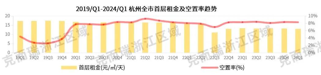 不過,據(jù)CAIC數(shù)據(jù),今年一季度杭州商業(yè)租賃物業(yè)的空置率環(huán)比下降1.31%至8.3%,首層租金環(huán)比下跌了0.6%至12.99元/㎡/天,顯示出租賃市場需求的增強。