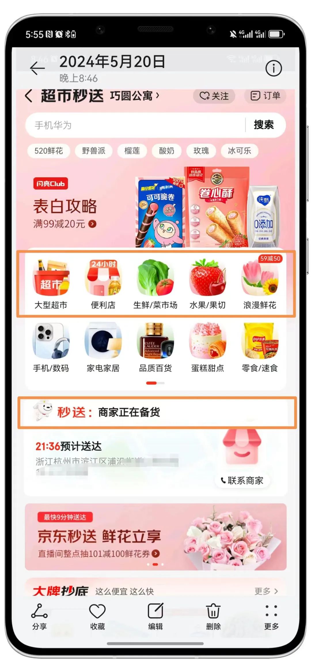 在京東頁(yè)面,秒送專(zhuān)區(qū)為消費(fèi)者直觀的提供了新鮮果蔬、鮮花蛋糕、超市秒送、咖啡奶茶、買(mǎi)藥秒送等5個(gè)場(chǎng)景化的頻道入口,用戶可以根據(jù)自身定位,篩選附近的各類(lèi)店鋪下單,并且入口也會(huì)依據(jù)用戶地址切換、消費(fèi)場(chǎng)景、促銷(xiāo)活動(dòng)、供給豐富度等維度產(chǎn)生改變,為消費(fèi)者呈現(xiàn)不同品類(lèi),當(dāng)前各品類(lèi)、場(chǎng)景下力度最大的促銷(xiāo)信息也能夠在專(zhuān)區(qū)上清晰展示。