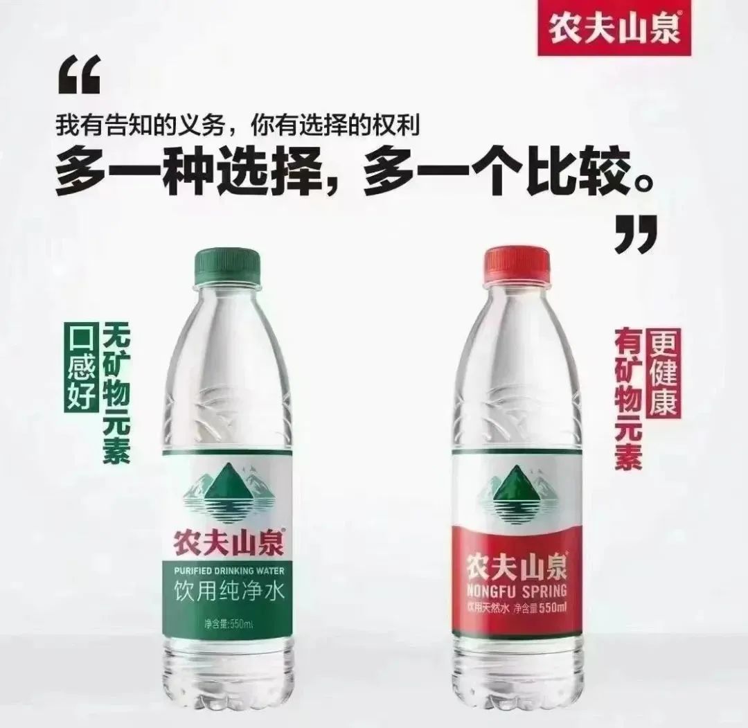 隨著農(nóng)夫山泉紅瓶的飲用天然水增長(zhǎng)放緩,不得已進(jìn)入到飲用純凈水類目中。