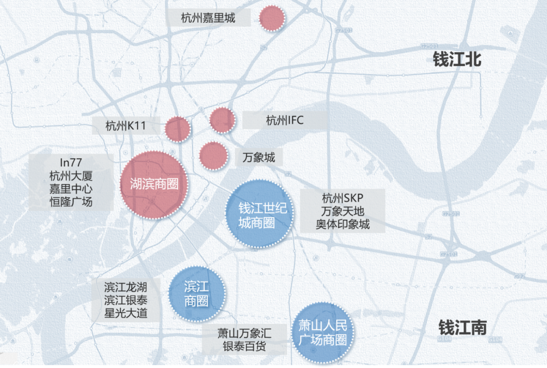 錢江南岸目前的兩個區(qū)域級商圈——濱江商圈、蕭山人民廣場商圈,仍然以傳統(tǒng)的標(biāo)準(zhǔn)化購物中心為主,在場景創(chuàng)新度、品牌級次、特色化打造方面跟未來的錢江世紀(jì)城商圈存在較大差距。