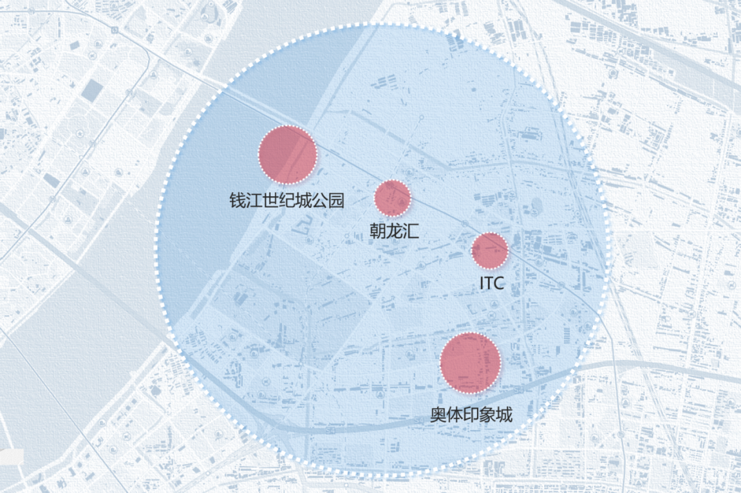 從人口熱力圖來看,匯德隆奧體印象城核心客群來自錢江世紀(jì)城板塊家庭、年輕、商務(wù)消費客群。