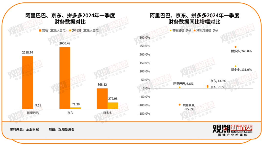 據(jù)財報數(shù)據(jù)顯示,阿里2023年全年收入達(dá)9274.93億元,同比增長7.28%;凈利潤同比增長166%至924億元;京東2023全年收入10847億元,同比增長3.7%,歸母凈利潤達(dá)241.67億元;拼多多2023全年營收為2476億元,同比增長90% ; 利潤達(dá)到600億元,同比增長90%。