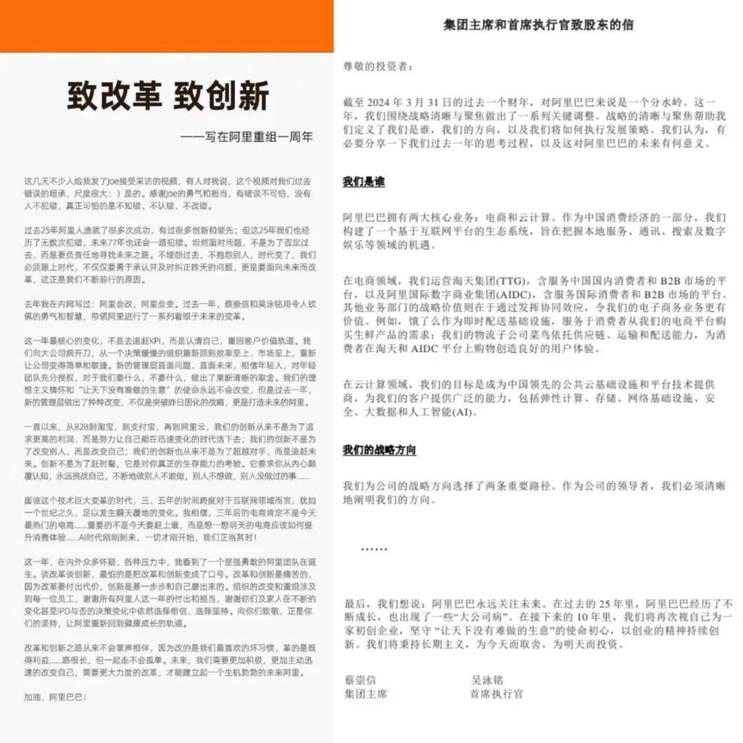 5月23日,阿里公布2024財(cái)年年報(bào)的同時(shí),也公布了一封由阿里巴巴董事長(zhǎng)蔡崇信和CEO吳泳銘首次聯(lián)合署名的致股東信。信中詳細(xì)闡述了阿里未來(lái)的戰(zhàn)略方向和經(jīng)營(yíng)細(xì)則,并在文末反思道,過(guò)去25年,阿里已經(jīng)出現(xiàn)“大公司病”,未來(lái)阿里將堅(jiān)定地向“大公司病”開(kāi)刀。