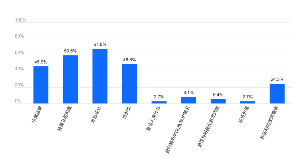調(diào)研還顯示,在選購手袋時,“外形設(shè)計” 是被最多消費者看重的因素,占比達(dá)到67%。此外,近六成受訪者更看重“容量及耐用度”,隨后才是“性價比”“所屬品牌”。