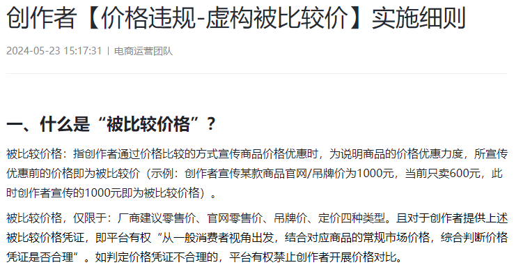 次月,抖音電商宣布《抖音電商創(chuàng)作者價格宣傳行為規(guī)范》經(jīng)修訂后正式生效,開始嚴(yán)厲打擊虛假比價行為。