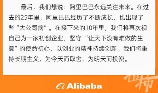 其中談到阿里大公司病的問題,蔡崇信、吳泳銘在股東信中寫道,在過去的25年里,阿里巴巴經(jīng)歷了不斷成長,也出現(xiàn)了一些“大公司病”的癥狀,他們同時表達了將積極對“大公司病”開刀、保持創(chuàng)業(yè)精神的決心。