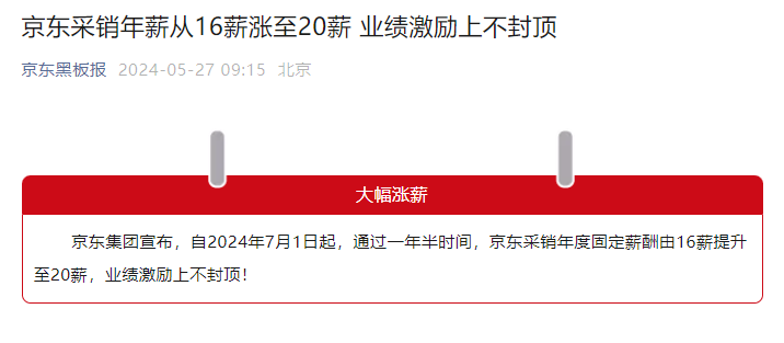 今日,京東再次宣布大幅漲薪。自2024年7月1日起,通過一年半時間,京東采銷年度固定薪酬由16薪提升至20薪,業(yè)績激勵上不封頂。