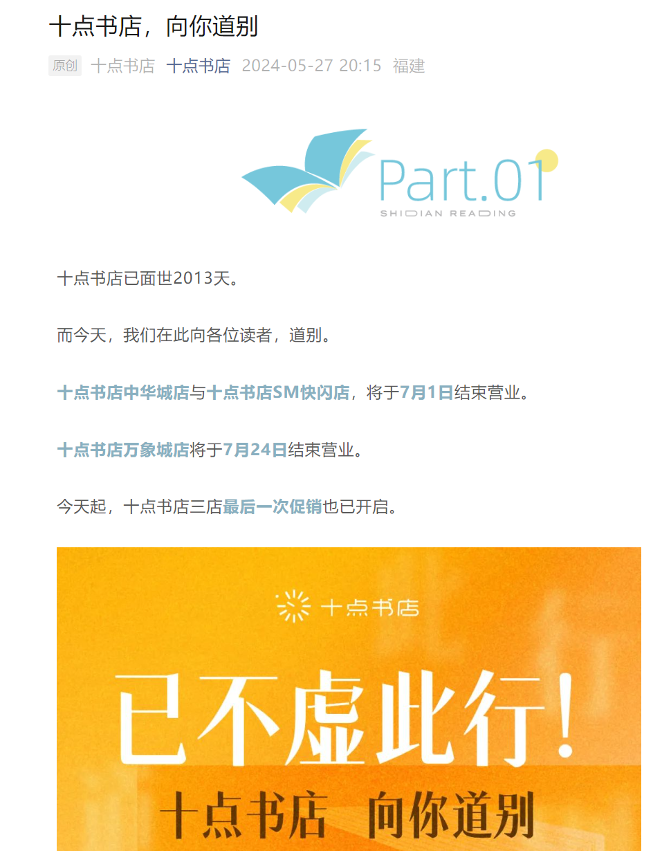 5月27日晚,十點(diǎn)書店發(fā)布通知稱,旗下位于福建的三間門店將于7月結(jié)束營業(yè)。其中,十點(diǎn)書店中華城店與十點(diǎn)書店SM快閃店,將于7月1日結(jié)束營業(yè)。十點(diǎn)書店萬象城店將于7月24日結(jié)束營業(yè)。這也意味著,十點(diǎn)書店正式關(guān)閉旗下的所有門店,退出實(shí)體書店行業(yè)。