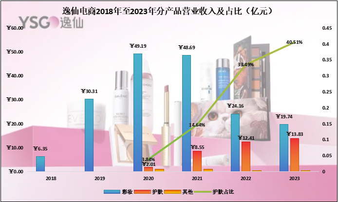從2021年起,逸仙電商的彩妝業(yè)務(wù)開始顯現(xiàn)頹勢,營收自2020年的49.19億元連續(xù)下降至2023年的19.74億元(萎縮了近6成);