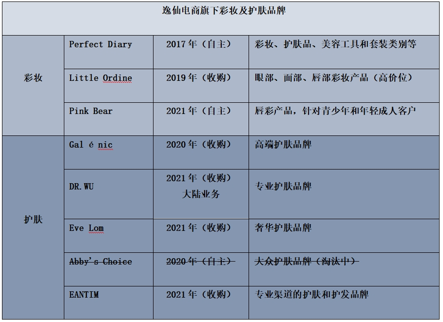逸仙電商的首個(gè)品牌“Perfect Diary”(完美日記)在其營銷模式走通之后,迅速通過收購、孵化等形式推出新的彩妝品牌以及延伸至護(hù)膚領(lǐng)域。