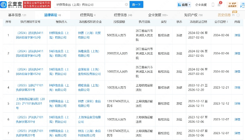 目前,鐘薛高旗下還有包括鐘嘉商貿(mào)、殊趣食品、盤箸有喜等多家子公司股權(quán)被凍結(jié),累計股權(quán)凍結(jié)數(shù)額近4000萬元。