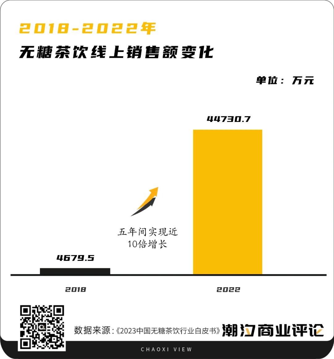 據(jù)億歐智庫發(fā)布的《2023中國無糖茶飲行業(yè)白皮書》,通過分析天貓淘寶平臺近五年的無糖茶飲料銷售額發(fā)現(xiàn),無糖茶飲在線上的銷售額從2018年的4679.5萬元,到2022年達到44730.7萬元,五年間實現(xiàn)了近10倍的增長。