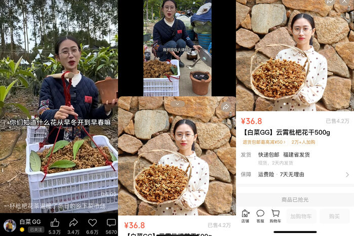 白菜GG(林萬華)是一位視頻號原生達人,她大學(xué)畢業(yè)后從事過服裝設(shè)計與銷售,三年前辭職回到家鄉(xiāng)福建省漳州市云霄縣,通過短視頻記錄鄉(xiāng)村集市及家鄉(xiāng)生活。今年,白菜GG通過一條短視頻帶貨家鄉(xiāng)的云霄枇杷花干,最終銷售量4.2萬,銷售額逼近155萬元。據(jù)稱,她一個人通過短視頻賣掉了縣里面絕大多數(shù)的枇杷花干。
