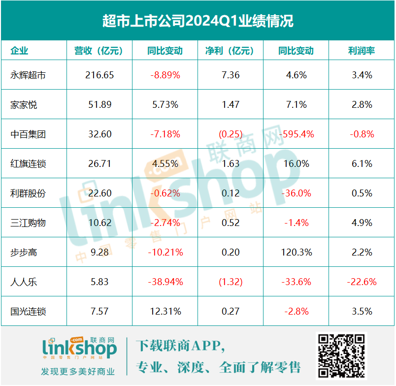 據(jù)聯(lián)商網(wǎng)統(tǒng)計(jì),2023財(cái)年,14家超市上市公司,營(yíng)收增長(zhǎng)的有4家且增幅均不超過(guò)10%,占比不足三成,而凈利增長(zhǎng)的有10家,只不過(guò)8家出現(xiàn)虧損,占比近六成;到2024Q1,統(tǒng)計(jì)的9家超市上市公司中,營(yíng)收增長(zhǎng)的僅有3家,利潤(rùn)增長(zhǎng)的有4家,與復(fù)蘇態(tài)勢(shì)相比,形勢(shì)依然不樂觀。