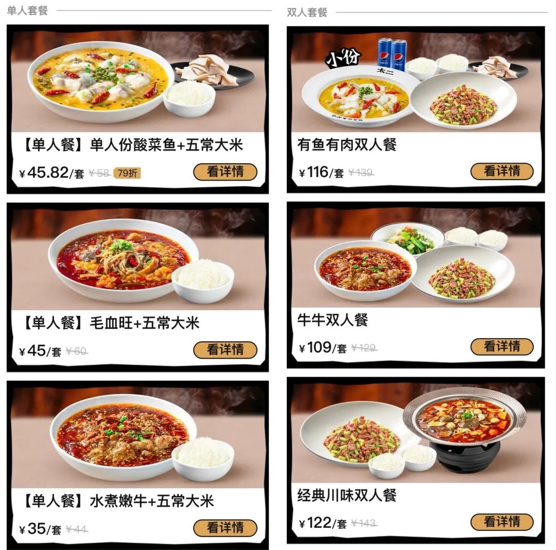 外賣店推出的水煮嫩牛、小炒牛肉、尖椒雞3款單人套餐均為35元,單人份酸菜魚和毛血旺套餐則為45元。而太二堂食門店僅推出一款單人餐,售價為45元。