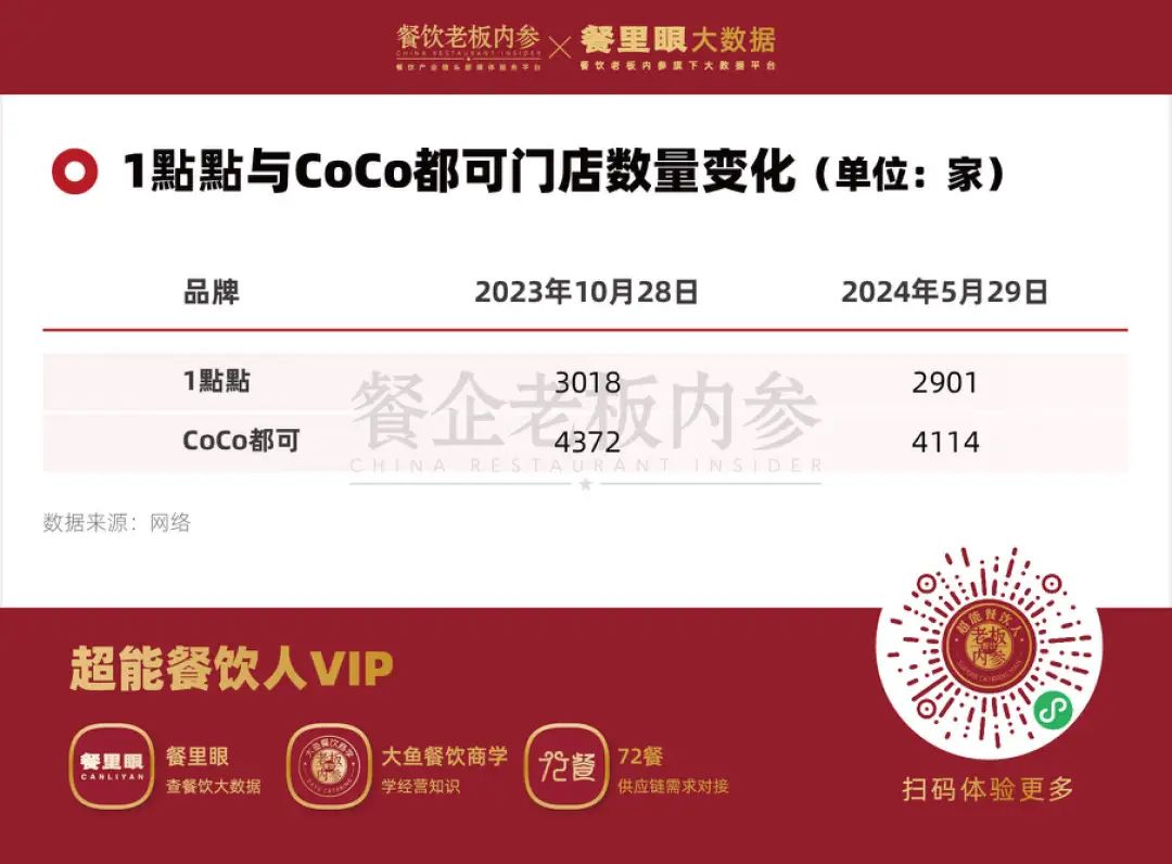 比如“初代奶茶網(wǎng)紅”1點點和CoCo都可,在新茶飲白熱化的市場競爭中漸漸失去競爭力,代表“紅火”的排隊景象幾乎不復(fù)存在,門店數(shù)量呈現(xiàn)負(fù)增長趨勢。
