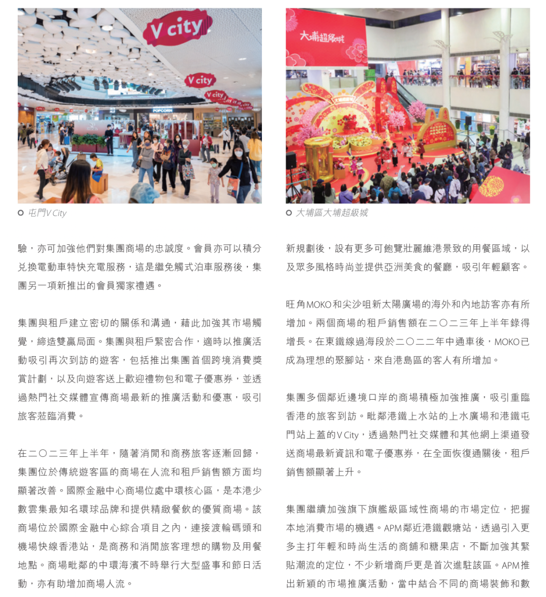 如,旺角MOKO和新太陽廣場海外和內(nèi)地訪客增加,銷售額錄得增長,其中MOKO成為外地游客落腳地;V City,社交聲量大,租戶和銷售額顯著上升;APM,強化潮流,引進多家區(qū)域首店,并舉辦大型活動,成為九龍東商業(yè)焦點。等等。