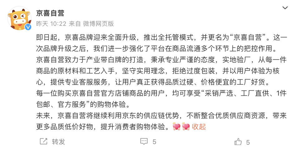 聯(lián)商快訊:5月29日,京東旗下的京喜業(yè)務(wù)發(fā)布微博稱,即日起品牌進(jìn)行全面升級,推出“京喜自營”全托管模式,并更名為“京喜自營”。