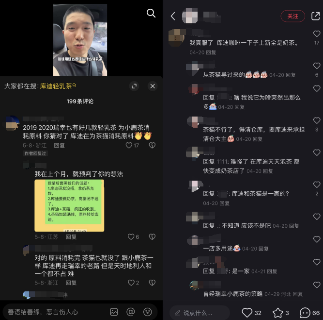 在庫迪上新輕乳茶的相關視頻評論區(qū),不止一位網(wǎng)友稱,“茶貓不行了,得清倉庫”、“原料消耗完,茶貓也就沒了”。