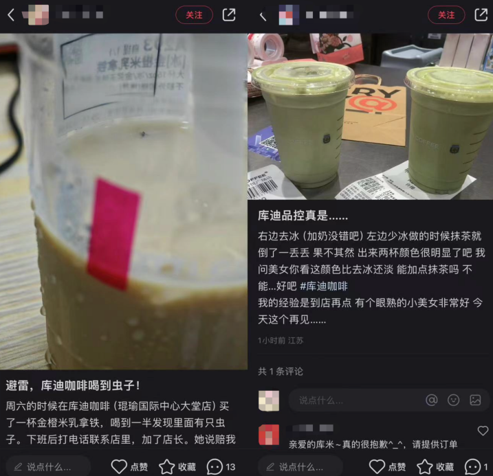 在社交平臺上,消費者針對庫迪“產(chǎn)品喝出蟲子”、“品控不讓人安心”的吐槽帖數(shù)量并不少。如此一來,必然會影響到品牌在大眾心里的印象分。